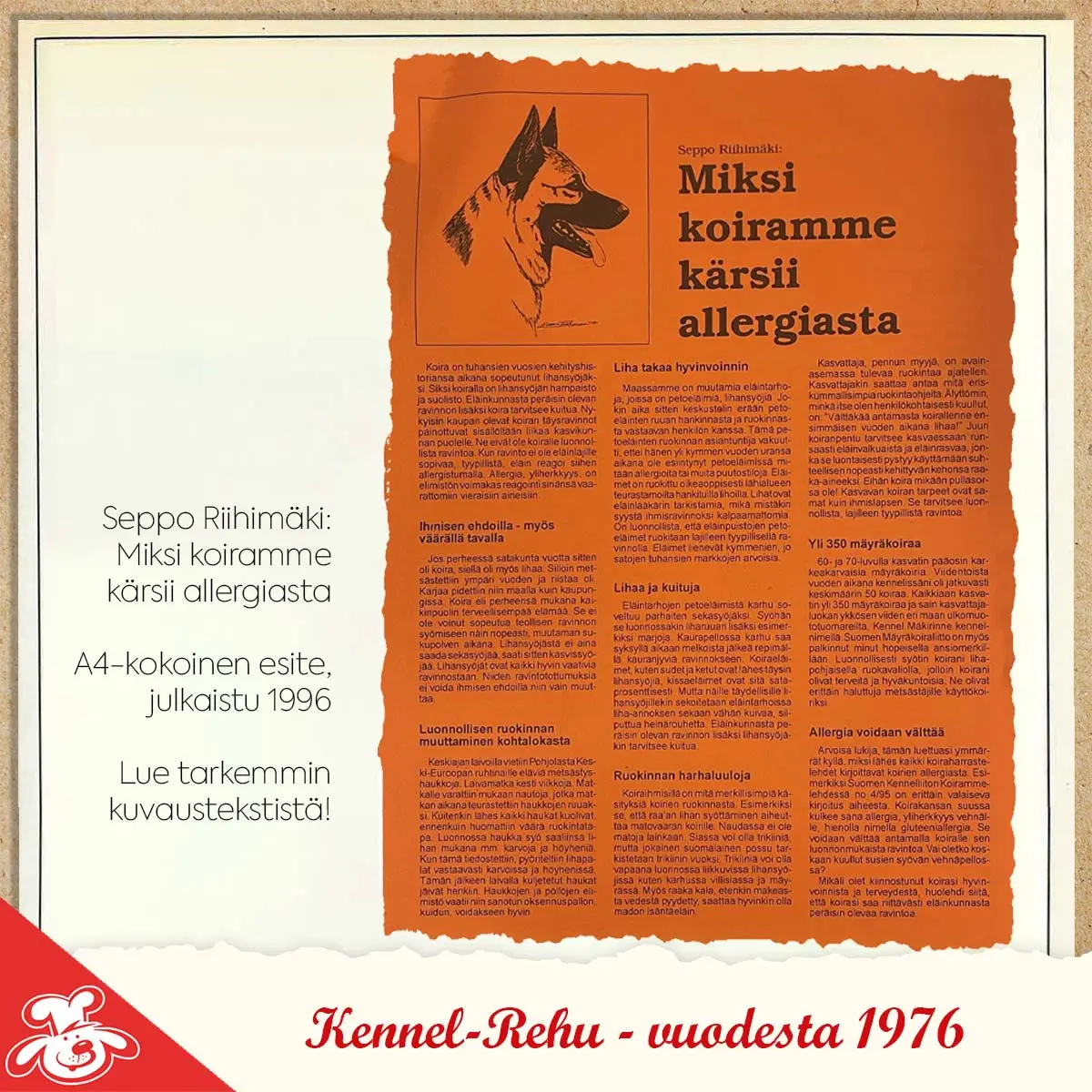 - Kennel-Rehun perustajalla, Seppo Riihimäellä, oli tapana tuottaa tekstejä ja artikkeleita koskien koirien lihapohjaista ruokintaa. Tässä esite vuodelta 1996, siis 30 vuoden takaa. Teksti kokonaisuudessaan: